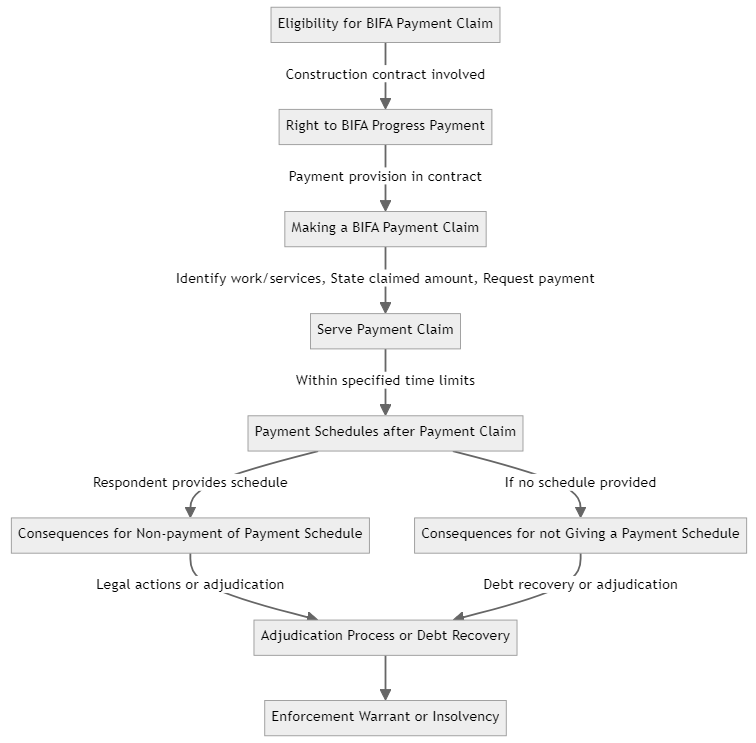 Making a BIFA payment claim involves identifying the construction work or related goods and services, stating the claimed amount, and requesting payment. The claim must be in writing and include all information prescribed by BIFA regulations. It’s crucial to serve the payment claim within the time limits set by BIFA to ensure its validity.